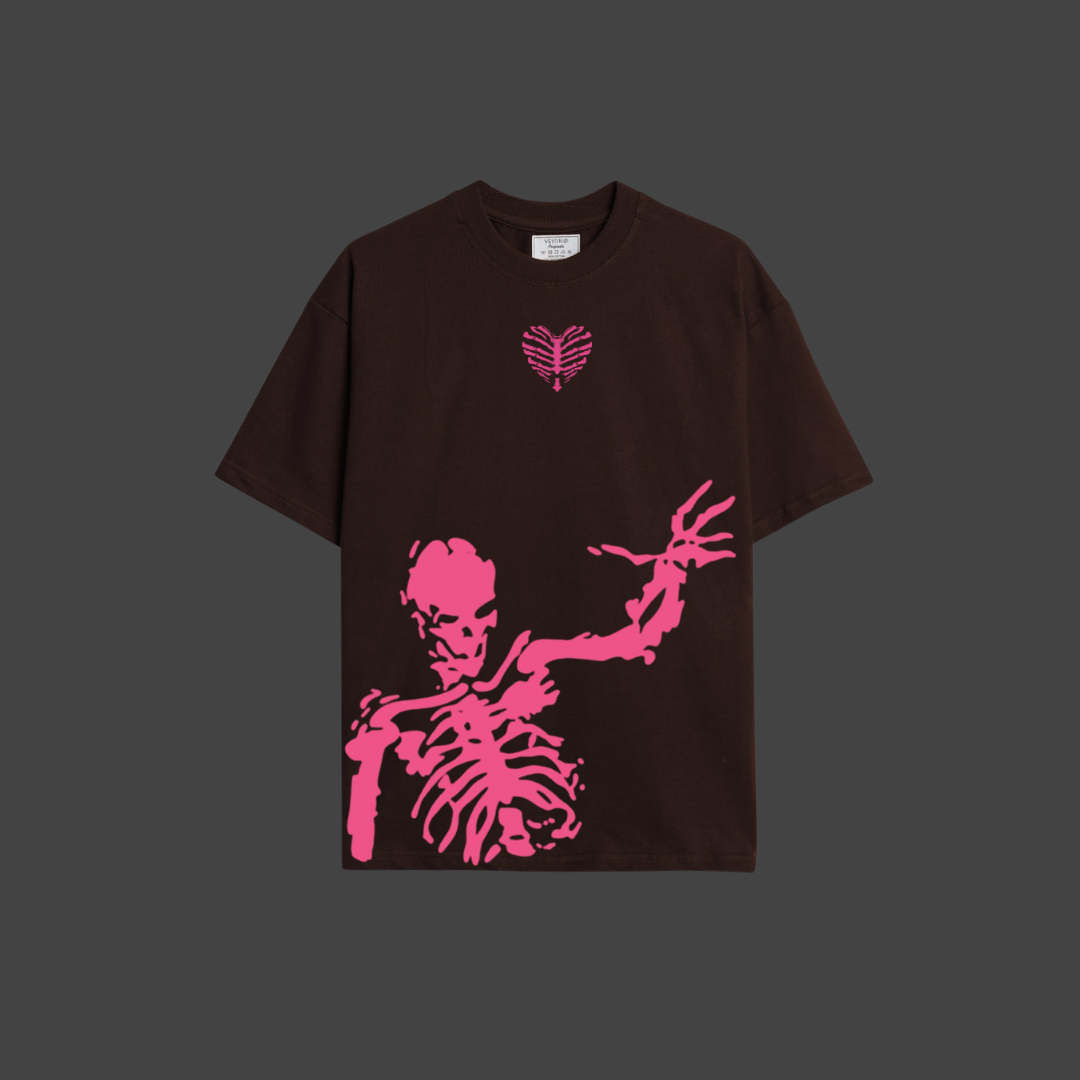 This oversized tee features a bold neon pink skeleton print on rich black-brown cotton, giving off eerie energy with every move. The glowing ribcage detail on the chest is your anti-valentine – a heart that beats rebellion.